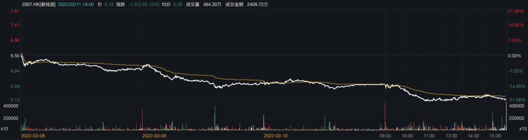 股票方面,3月11日,碧桂园地产所属港股上市公司碧桂园控股有限公司(债券简称碧桂园,股票代码02007)股价下跌7.82%,近四个交易日(3月8日-11日)股价连续下跌,累计跌幅为20.15%。