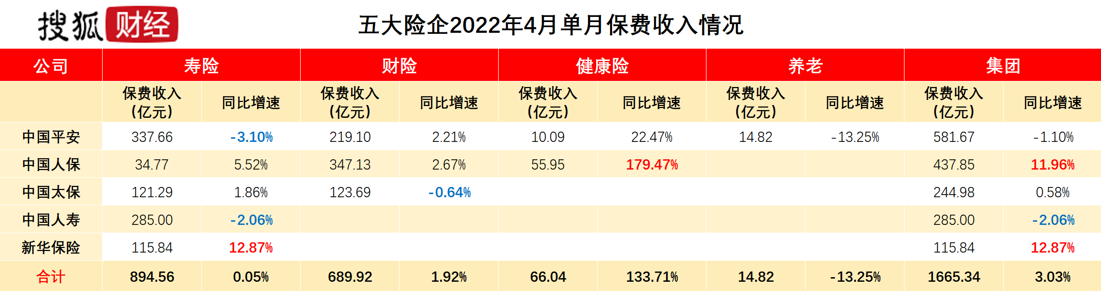数据显示,2022年1-4月,五险企共实现保费收入11740.09亿元,同比增长3.45%;4月单月保费1665.34亿元,同比增长3.03%,环比下降38.9%。