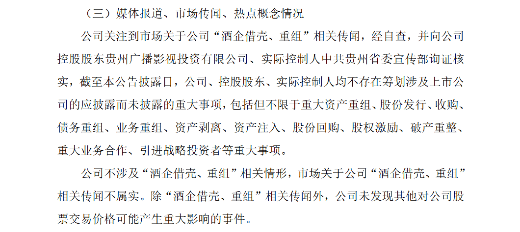 针对股价连续大幅上涨,贵广网络于当日盘后发布澄清公告称,经公司自查,不涉及“酒企借壳、重组”相关情形,市场关于公司“酒企借壳、重组”相关传闻不属实。
