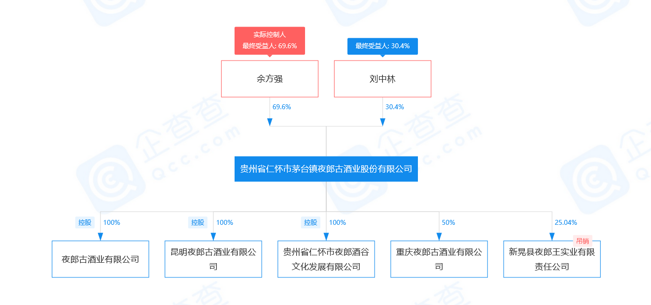 根据企查查显示,目前,余方强持股夜郎古酒业69.6%,副董事长刘中林持股30.4%。