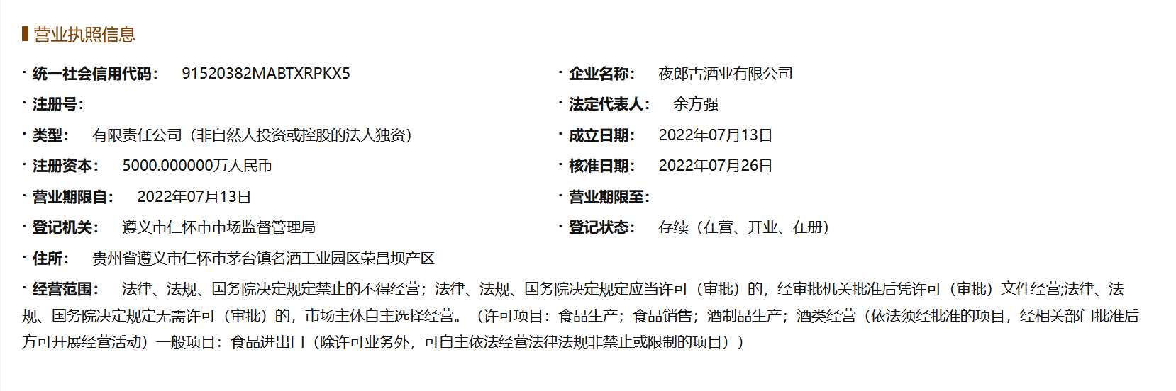 截至目前,搜狐财经查阅国家企业信用信息系统发现,仅有一家名为“夜郎古酒业有限公司”于今年7月16日刚成立,注册资本5000万元,法定代表人为余方强,唯一大股东为贵州省仁怀市茅台镇夜郎古酒业股份有限公司,即夜郎古酒的主体公司。