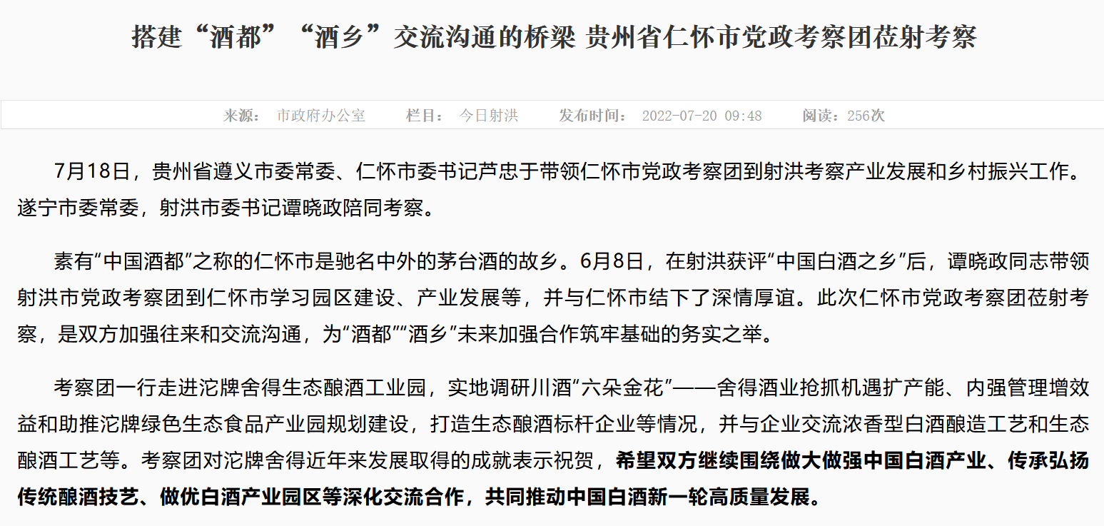 搜狐财经在射洪市官网搜索发现,今年6月,射洪市委书记曾带队前往贵州省仁怀市进行考察。随后今年7月,仁怀市委书记带队回访。