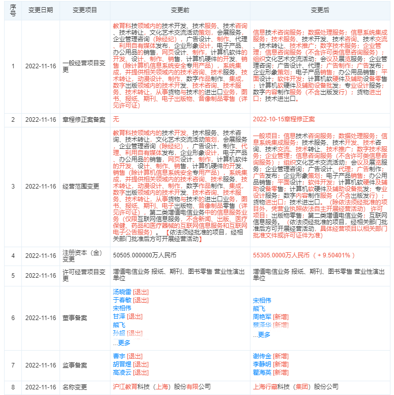 蓝鲸教育11月24日讯,近日,据天眼查显示,沪江教育更名为上海行藏科技(集团)股份公司,经营范围剔除教育科技领域内的技术开发等。