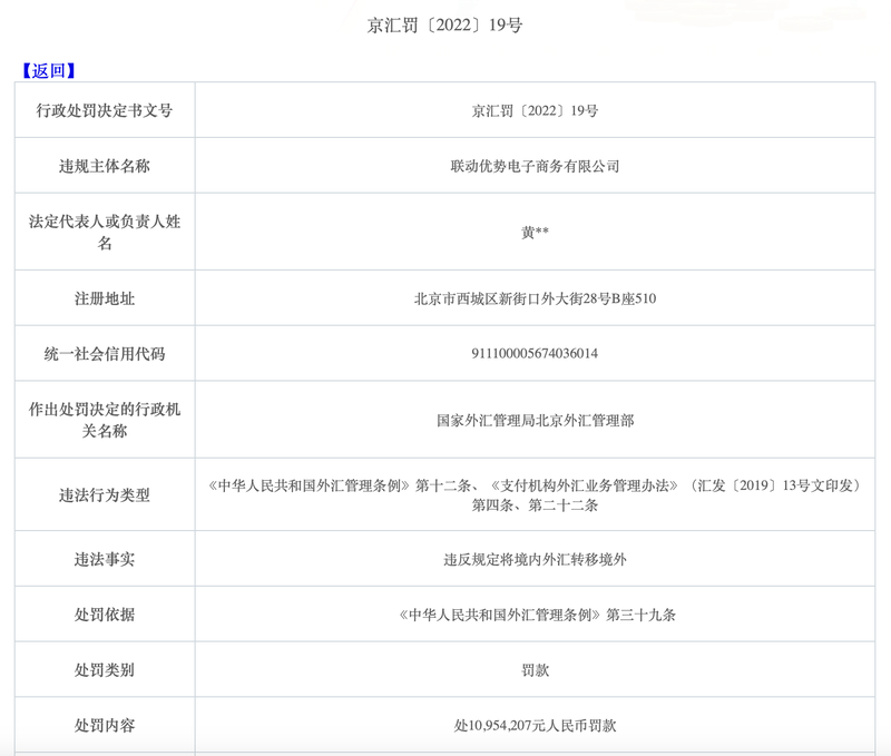 日前,国家外汇管理局北京外汇管理部发布一则行政处罚信息显示,上海联动优势电子商务有限公司(下称“联动优势”)因违反规定将境内外汇转移境外,被国家外汇管理局罚款1095.42万元。