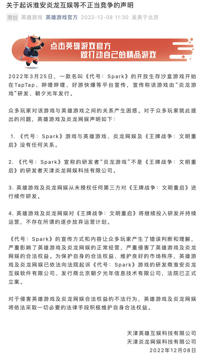 根据声明,2022年3月25日,一款名叫《代号:Spark》的开放生存沙盒游戏开始在TapTap、哔哩哔哩、好游快爆等平台宣传,宣传称该游戏由“炎龙游戏”研发、朝夕光年发行。众多玩家对该游戏与英雄游戏之间的关系产生困惑。