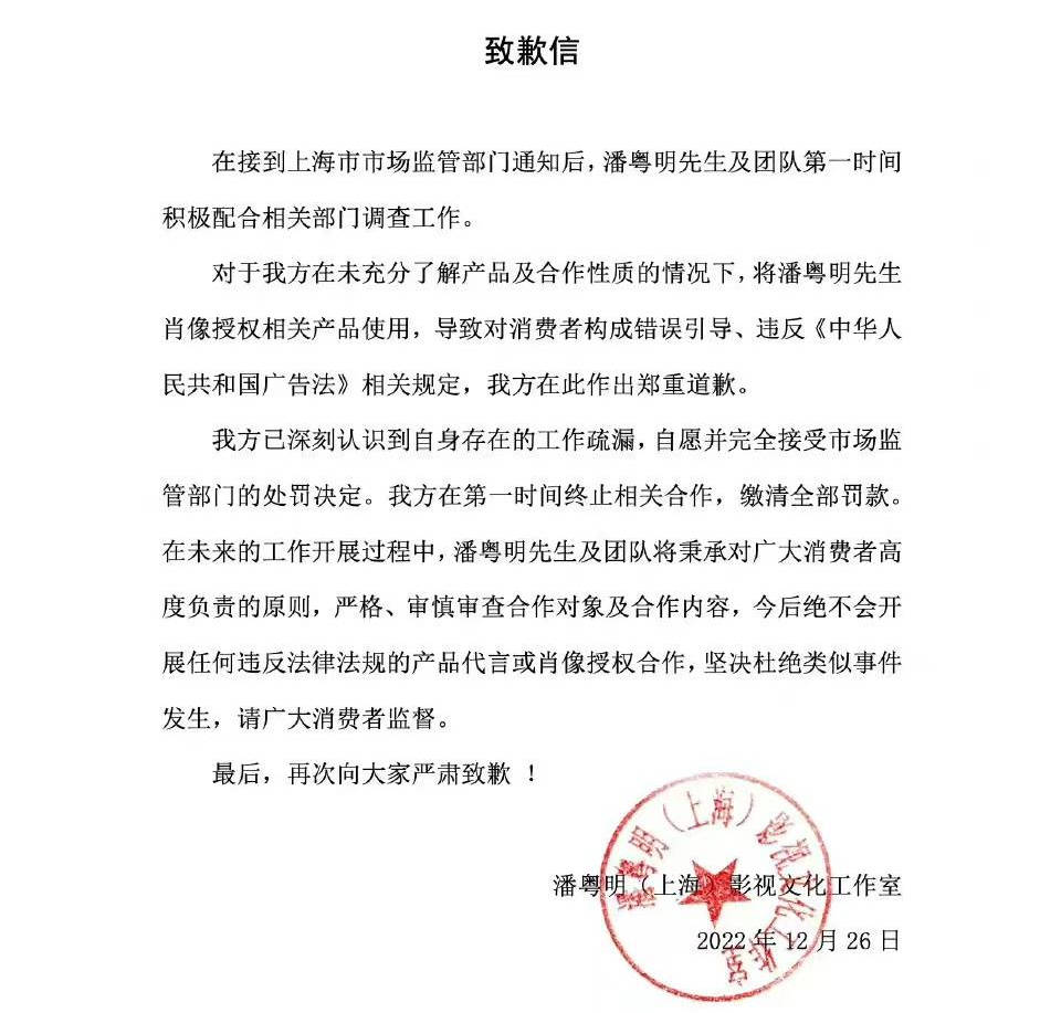 12月26日,潘粤明转发其工作室发布的致歉信,并表示对于给广大消费者带来的困扰和不便非常抱歉,并与团队深刻反省,日后会严格要求、规范合作,坚决杜绝此类事件的发生。
