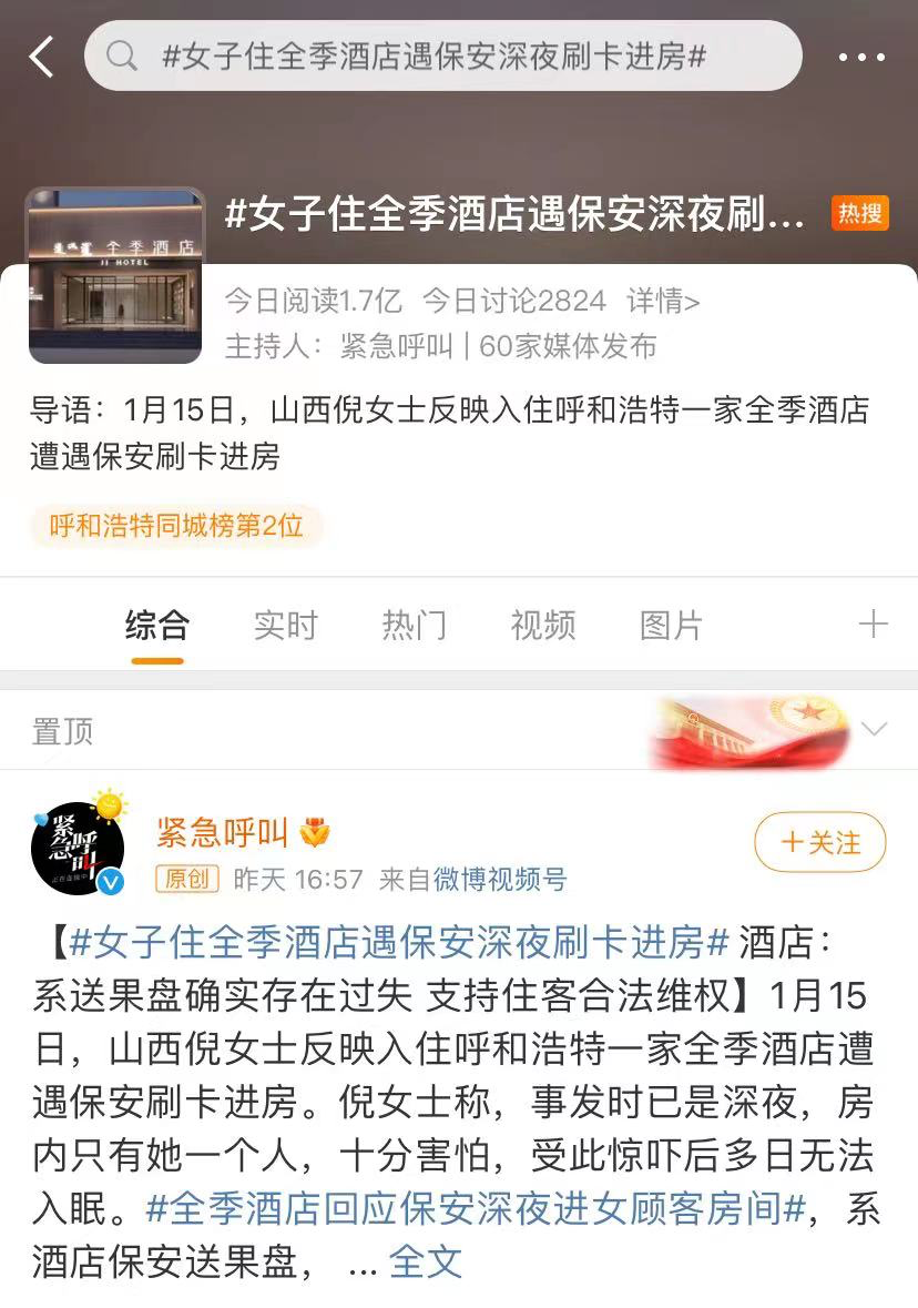 女子住全季酒遇保安深夜刷卡进房,索赔2万元遭拒!律师:侵害隐私权