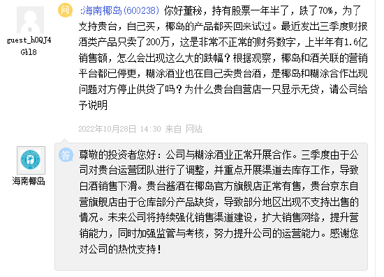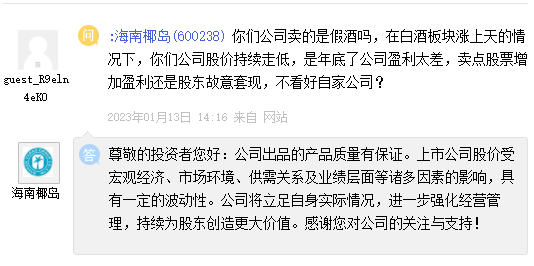 海南椰岛股价频频被投资者质疑:在上证e互动上,有投资者质问“为何白酒版块上涨的情况下,公司股价却持续走低?”还有投资者无奈“持有股票一年半,跌了70%。”