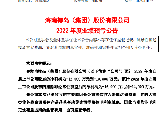 曾经的“保健酒第一股”海南椰岛业绩持续亏损。继2021年亏损超6000万元后,2022年再预亏超1亿元。