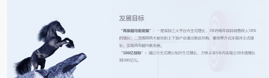 二是“500亿目标”:通过内生式增长和外生式增长,力争未来5年内实现公司市值增长到500亿元。