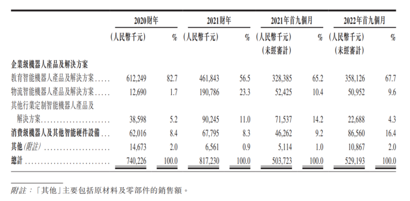 根据招股书,在2020财年,教育智能机器人产品及解决方案创造营收6.12亿元,占到了总营收的82.7%。到2022财年前九个月,这一比例虽然有所减少,但仍然占到了67.7%。根据弗若斯特沙利文的数据,按2021年收入计算,优必选是中国第一大教育智能机器人产品及解决方案供应商。