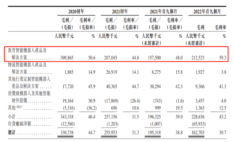 教育业务不仅贡献了营收,其较高的毛利水平也让优必选可以在十分依赖投入的赛道里走得更加稳健。从招股书看,教育智能机器人产品及解决方案始终是毛利最高的业务。2022财年前9个月,其毛利率达到59.3%,比上一年同期高11.3个百分点,毛利水平远超其他业务。