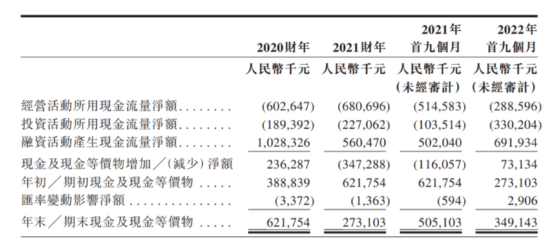 由于亏损问题难以避免,优必选始终处于现金净流出阶段。2020财年经营活动现金流出6.03亿,2021财年流出6.81亿,2022年前9个月流出2.89亿。