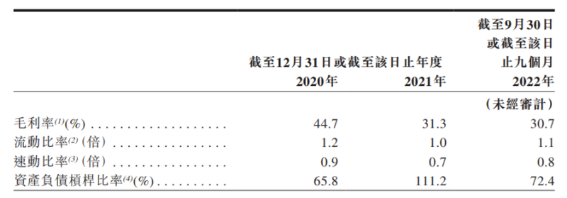 与此同时,优必选的偿债压力也在增加。截至2021年12月31日,优必选的流动比率为1.0倍、速动比率为0.7倍,比上一财年都出现下滑。资产负债杠杆比率达到111.2%,比上一财年末大幅增加45.4个百分点。截止到2022年9月30日,其上述相关数据虽然有所缓解,但仍高于2020年末的水平。