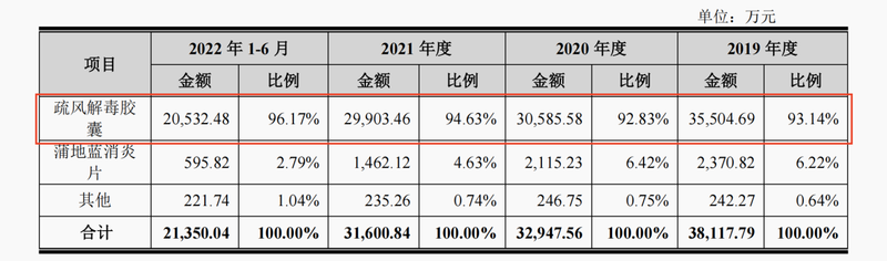在2019年至2021年以及2022年1-6月的报告期内,济人药业分别又48.34%、45.05%、39.24%和47.53%的收入来自中成药,销售的中成药中疏风解毒胶囊占比又分别为93.14%、92.83%、94.63%和96.17%。