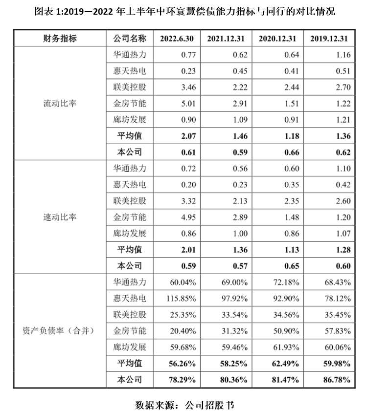 在招股书中,华通热力(002893.SZ)、惠天热电(000692.SZ)、联美控股(600167.SH)、金房节能(001210.SZ)、廊坊发展(600149.SH)等被中环寰慧列为同行可比上市公司。2019—2022年上半年各期末,上述同行的资产负债率均值分别为59.98%、62.49%、58.25%、56.26%,约比中环寰慧低20个百分点。