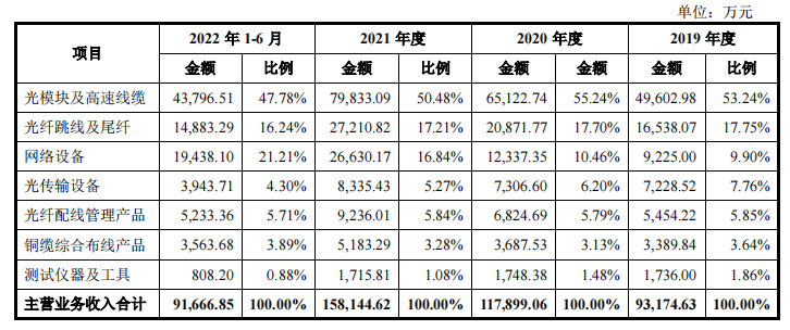 报告期内,公司的主营业务收入主要来自于光模块及高速线缆、光纤跳线及尾纤和网络设备,上述三大类产品报告期各年的销售收入占主营业务收入的比例合计超过80%。