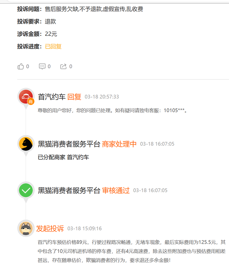例如,3月18日,匿名网友发起一笔投诉显示,首汽约车预估价格89元,行驶过程路况畅通,无堵车现象,最后实际费用为125.5元,其中包含了10元司机进机场的停车费,还有4元高速费。该消费者表示,除去这些附加费也与预估费用相差甚远,首汽约车存在随意估价,欺骗消费者的行为,并要求退还多余金额。