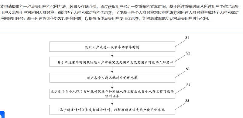 有意思的是,记者发现,近日首汽约车公开了“流失用户的召回方法、装置及存储介质”专利。该专利基于所述呼叫任务发起语音呼叫,以提醒所述流失用户使用优惠券,实现对流失用户进行召回。