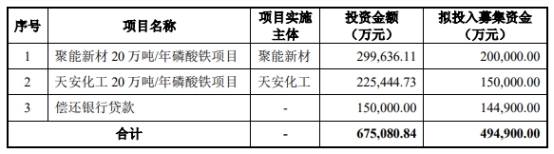 云天化2023年9月13日披露的2022年度向特定对象发行A股股票募集说明书(2023年半年报财务数据更新版)显示,公司本次向特定对象发行A股股票的募集资金总额不超过494,900.00万元,扣除发行费用后用于“聚能新材20万吨/年磷酸铁项目”、“天安化工20万吨/年磷酸铁项目”以及“偿还银行贷款”。