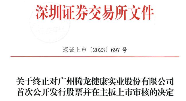 2023年11月21日,腾龙健康向深交所提交了《广州腾龙健康实业股份有限公司关于撤回首次公开发行股票并在主板上市申请文件的申请》,保荐人向深交所提交了《国信证券股份有限公司关于撤回广州腾龙健康实业股份有限公司首次公开发行股票并在主板上市申请文件的申请》。根据《深圳证券交易所股票发行上市审核规则》第六十二条的有关规定,深交所决定终止对腾龙健康首次公开发行股票并在主板上市的审核。