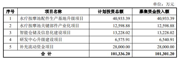 腾龙健康原拟公开发行股份不超过3,168.00万股,均为新股发行,公司股东不进行公开发售,最终发行数量经中国证监会核准后确定。本次发行股数占发行后总股本的比例不低于25%。腾龙健康原拟募集资金101,301.20万元,分别用于水疗按摩池配件生产基地升级项目、水疗按摩池关键部件产业化项目、智能仓储及信息化建设项目、研发中心升级建设项目、补充流动资金项目。