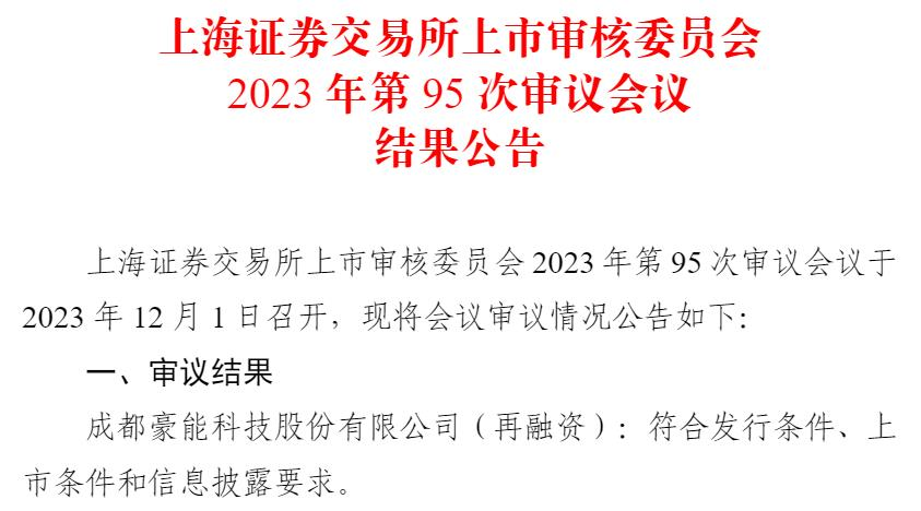 中国经济网北京12月4日讯 上交所上市审核委员会2023年第95次审议会议于2023年12月1日召开,审议结果显示,成都豪能科技股份有限公司(“豪能股份”,603809.SH)再融资符合发行条件、上市条件和信息披露要求。