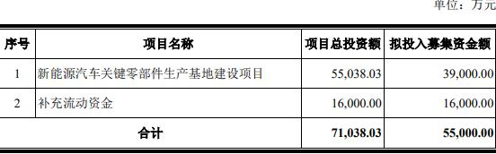 公司本次发行拟募集资金总额不超过55,000.00万元(含55,000.00万元),扣除发行费用后,募集资金拟投资于新能源汽车关键零部件生产基地建设项目、补充流动资金。