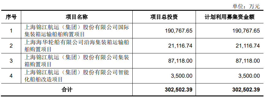 锦江航运2023年11月30日披露的招股说明书显示,公司拟募集资金302,502.39万元,用于上海锦江航运(集团)股份有限公司国际集装箱运输船舶购置项目、上海海华轮船有限公司沿海集装箱运输船舶购置项目、上海锦江航运(集团)股份有限公司集装箱购置项目、上海锦江航运(集团)股份有限公司智能化船舶改造项目。