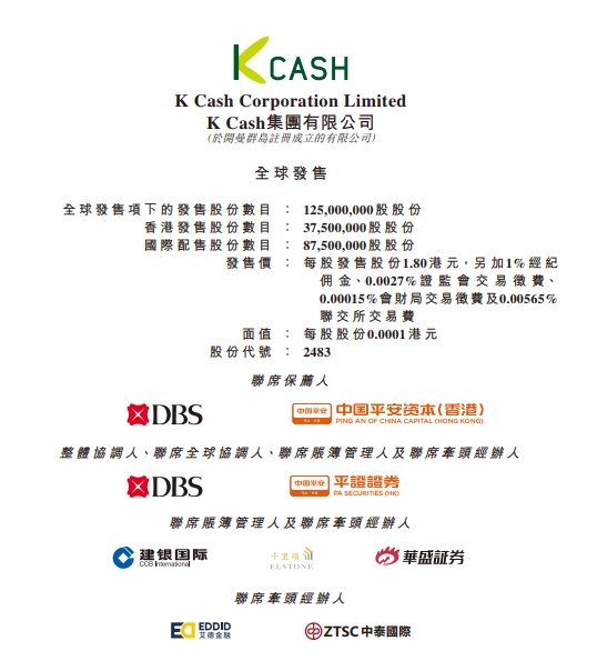 K CASH集团的联席保荐人为星展亚洲融资有限公司及中国平安资本(香港)有限公司;整体协调人、联席全球协调人、联席账簿管理人及联席牵头经办人为星展亚洲融资有限公司及平证证券(香港)有限公司;联席账簿管理人及联席牵头经办人为建银国际金融有限公司、千里硕证券有限公司及华盛资本证券有限公司;联席牵头经办人为艾德证券期货有限公司及中泰国际证券有限公司。