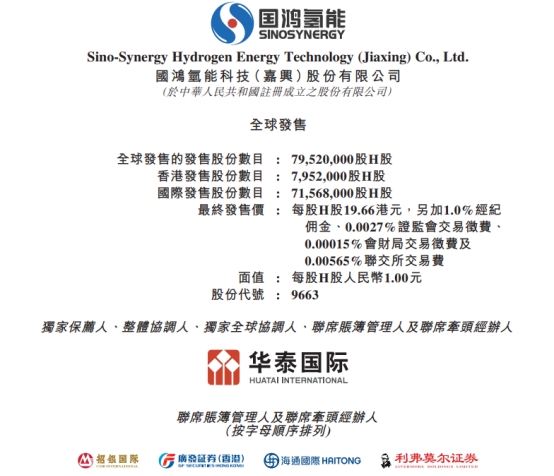 根据公告,国鸿氢能的最终发售价为每股H股19.66港元,另加1.0%经纪佣金、0.0027%证监会交易征费、0.00015%会财局交易征费及0.00565%联交所交易费。