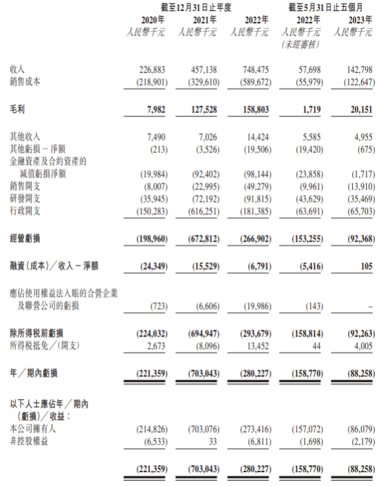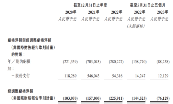 截至2020年、2021年、2022年12月31日止年度以及截至2022年及2023年5月31日止五个月,公司分别录得经营活动所用现金净额人民币86.6百万元、人民币560.7百万元、人民币261.3百万元、人民币150.0百万元及人民币87.8百万元。