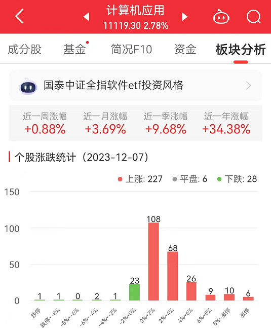 中国经济网北京12月7日讯 今日,计算机应用板块整体涨幅2.78%,其中,227只股票上涨,6只股票平盘,28只股票下跌。