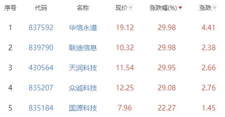 其中,华信永道、联迪信息、天润科技、众诚科技、国源科技位列板块涨幅前五位,涨幅分别为29.98%、29.98%、29.95%、29.08%、22.27%。
