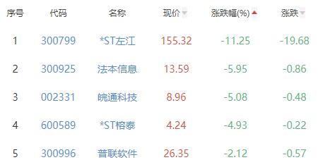 *ST左江、法本信息、皖通科技、*ST榕泰、普联软件位列涨幅榜后五位,涨幅分别为-11.25%、-5.95%、-5.08%、-4.93%、-2.12%。