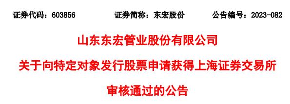 中国经济网北京12月8日讯 山东东宏管业股份有限公司(简称“东宏股份”,603856.SH)昨晚发布关于向特定对象发行股票申请获得上海证券交易所审核通过的公告。山东东宏管业股份有限公司于2023年12月7日收到上海证券交易所上市审核中心出具的《关于山东东宏管业股份有限公司向特定对象发行股票审核意见的通知》,具体审核意见如下:“山东东宏管业股份有限公司向特定对象发行股票申请符合发行条件、上市条件和信息披露要求。本所将在履行相关程序并收到你公司申请文件后提交中国证监会注册。”