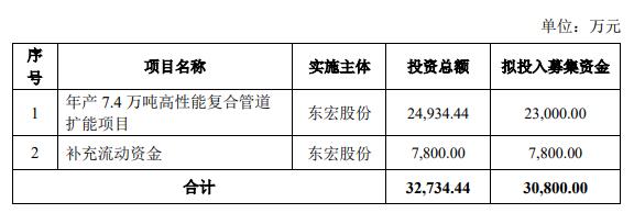 10月28日,东宏股份发布向特定对象发行A股股票预案(三次修订稿)。本次发行拟募集资金总额不超过30,800.00万元(含本数),扣除发行费用后的募集资金拟全部用于年产7.4万吨高性能复合管道扩能项目、补充流动资金。