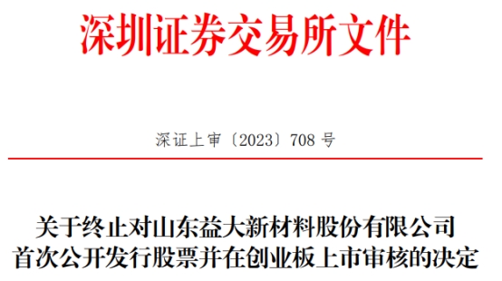 深交所于2022年12月22日依法受理了益大新材首次公开发行股票并在创业板上市的申请文件,并依法依规进行了审核。2023年12月6日,益大新材向深交所提交了《山东益大新材料股份有限公司关于撤回首次公开发行股票并在创业板上市申请文件的申请》,保荐人中德证券有限责任公司向深交所提交了《关于撤回山东益大新材料股份有限公司首次公开发行股票并在创业板上市申请文件的申请》。根据《深圳证券交易所股票发行上市审核规则》第六十二条的有关规定,深交所决定终止对益大新材首次公开发行股票并在创业板上市的审核。