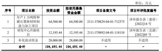 益大新材原拟在深交所创业板公开发行股票数量不超过7,375.9051万股,占发行后公司总股本的比例不低于25%;原拟募集资金104,695.44万元,计划用于年产1万吨特种碳石墨新材料制造与加工项目、研发中心升级项目、补充流动资金。