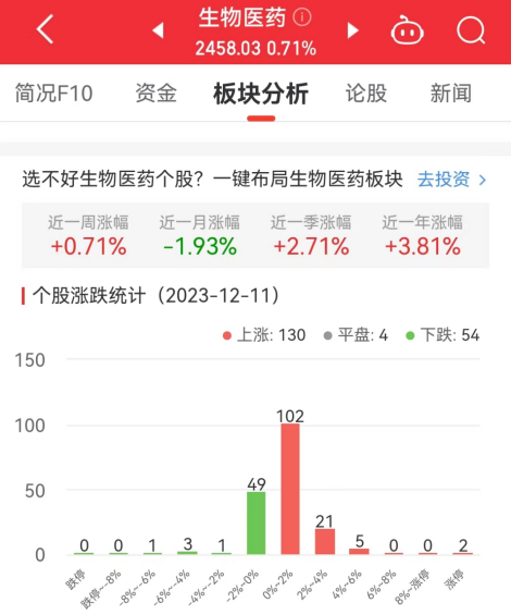 中国经济网北京12月11日讯 今日,生物医药板块整体涨幅0.71%,其中130只股票上涨,4只股票平盘,54只股票下跌。