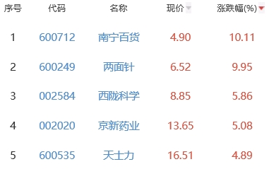 其中,南宁百货、两面针、西陇科学、京新药业、天士力位列板块涨幅前五位,涨幅分别为10.11%、9.95%、5.86%、5.08%、4.89%。