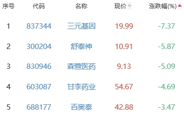 三元基因、舒泰神、森萱医药、甘李药业、百奥泰位列涨幅榜后五位,涨幅分别为-7.37%、-5.87%、-5.09%、-4.69%、-3.47%。