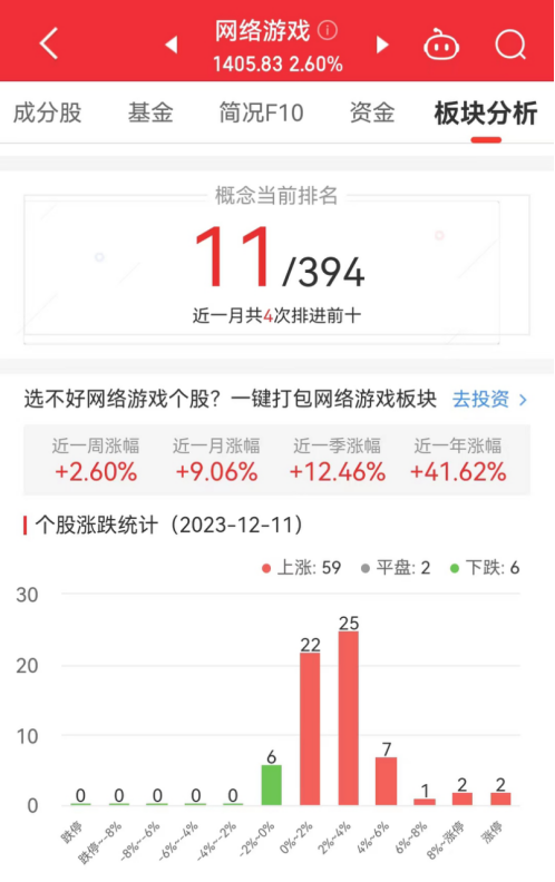 中国经济网北京12月11日讯 今日,网络游戏板块整体涨幅2.6%,其中,59只股票上涨,2只股票平盘,6只股票下跌。