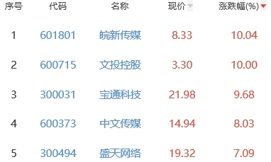 其中,皖新传媒、文投控股、宝通科技、中文传媒、盛天网络位列板块涨幅前五位,涨幅分别为10.04%、10.00%、9.68%、8.03%、7.09%。