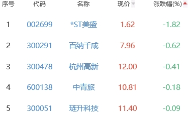 *ST美盛、百纳千成、杭州高新、中青旅、琏升科技位列涨幅榜后五位,涨幅分别为-1.82%、-0.62%、-0.41%、-0.18%、-0.09%。