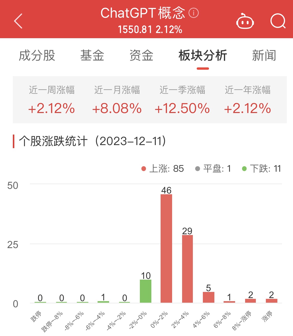 中国经济网北京12月11日讯 今日,ChatGPT概念板块整体涨幅2.12%,其中85只股票上涨,1只股票平盘,11只股票下跌。