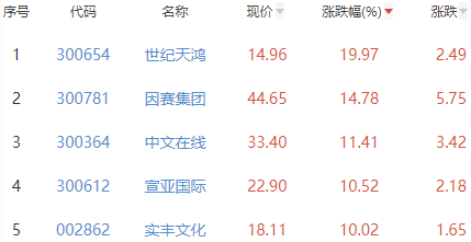 其中,世纪天鸿、因赛集团、中文在线、宣亚国际和实丰文化位列板块涨幅前五位,涨幅分别为19.97%、14.78%、11.41%、10.52%和10.02%。