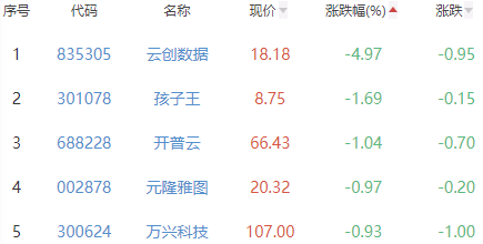 云创数据、孩子王、开普云、元隆雅图和万兴科技位列涨幅榜后五位,涨幅分别为-4.97%、-1.69%、-1.04%、-0.97%和-0.93%。
