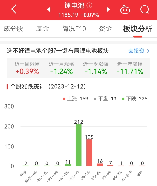 中国经济网北京12月12日讯 今日,锂电池板块整体跌幅0.07%,其中159只股票上涨,13只股票平盘,225只股票下跌。