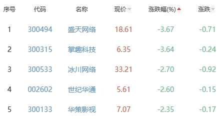 盛天网络、掌趣科技、冰川网络、世纪华通、华策影视位列涨幅榜后五位,涨幅分别为-3.67%、-3.64%、-2.70%、-2.60%、-2.35%。
